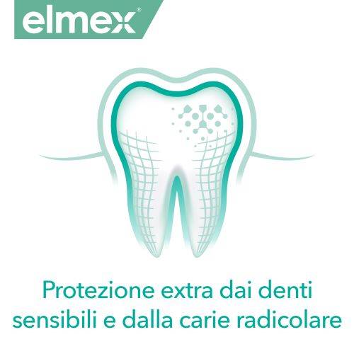 *L’utilizzo quotidiano del collutorio elmex® SENSITIVE per almeno 3 mesi, in aggiunta al dentifricio elmex® SENSITIVE, offre una protezione 3 volte superiore dalla carie radicolare intorno alla dentina rispetto all'utilizzo del solo dentifricio.